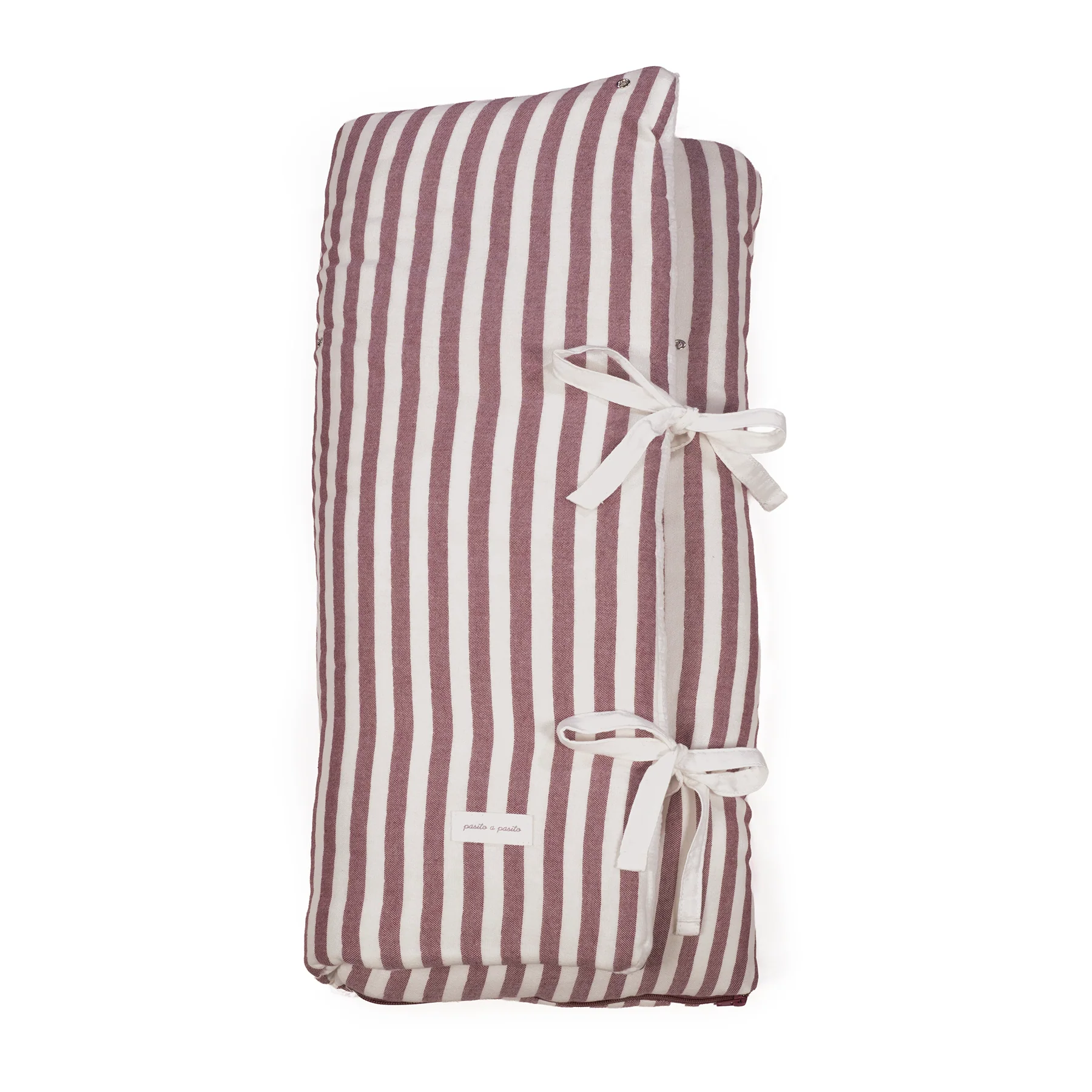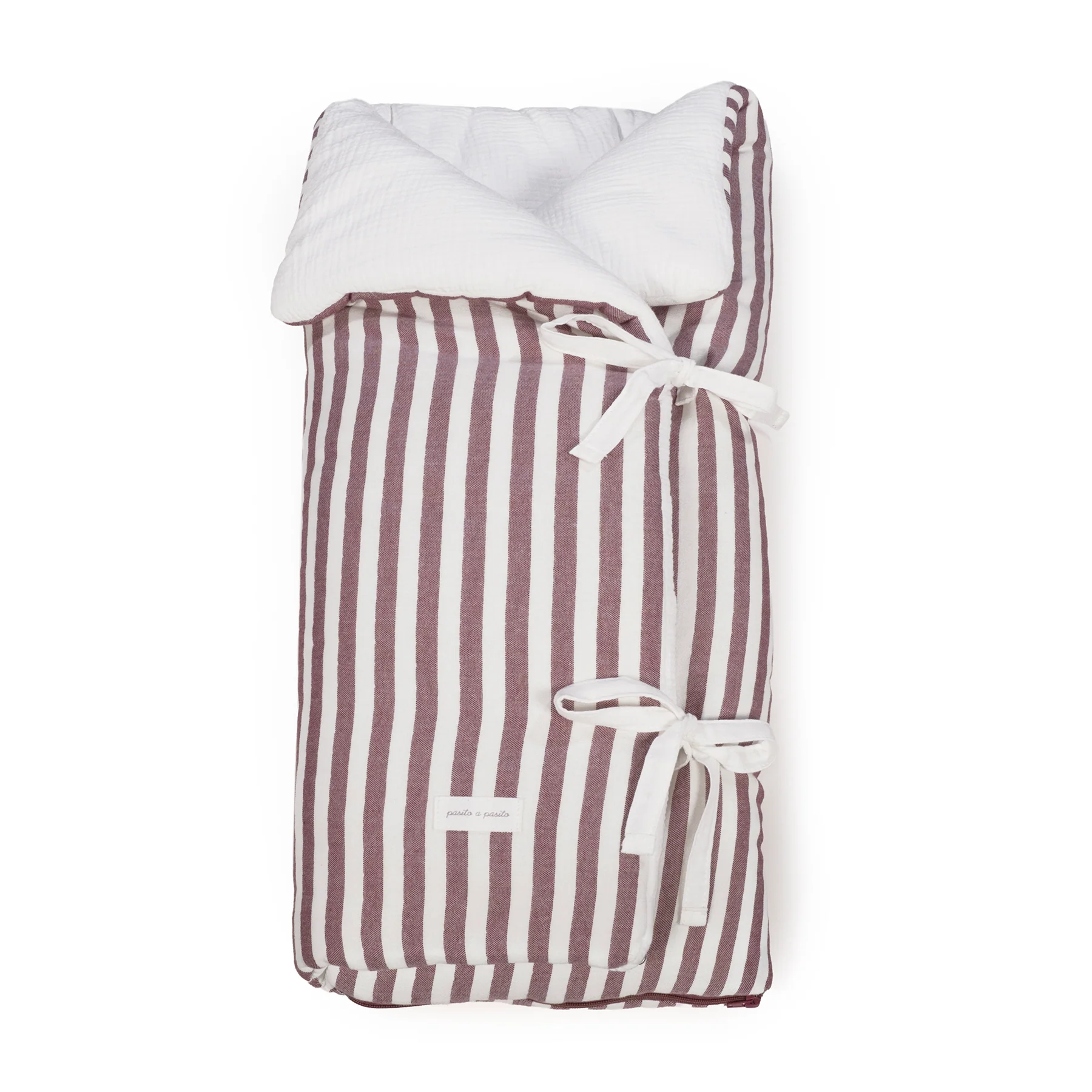 Saco arrullo o saco manta Cherry de Pasito a pasito. Está fabricado con una suave muselina de rayas 100% algodón en el exterior y muselina lisa en el interior de 70% bambú y 30% algodón. Ideal para los primeros dias del bebé. Es perfecto para los primeros paseos en el capazo. Se convierte en una manta para la cuna. Practico cierre tipo sobre con lazos y cierre con cremallera en la parte inferior en los pies para que el bebé esté abrigado. Gran calidad y mucho estilo. Todas nuestras fundas están fabricadas conforme a las más exigentes normativas europeas, con materiales de gran calidad, libres de colorantes azoicos, ftalatos y sustancias nocivas para la salud. Tela de fácil limpieza, se recomienda lavar a máquina a 30º. Los productos para bebé de Pasito a Pasito cuentan con un diseño muy diferente a todas las demás. Sus colecciones se caracterizan por el trabajo al detallada, pensadas siempre desde un punto de vista práctico. Utilizan materiales de primera calidad para remarcar la elegancia y la armonía en cada una de sus piezas. Nuestros modelos son exclusivos y de estilo inconfundible, pensados en las madres actuales que gozan de buen gusto y que aprecian los detalles tanto como nosotros. Especificaciones: Materiales: 100% algodón. Universal.