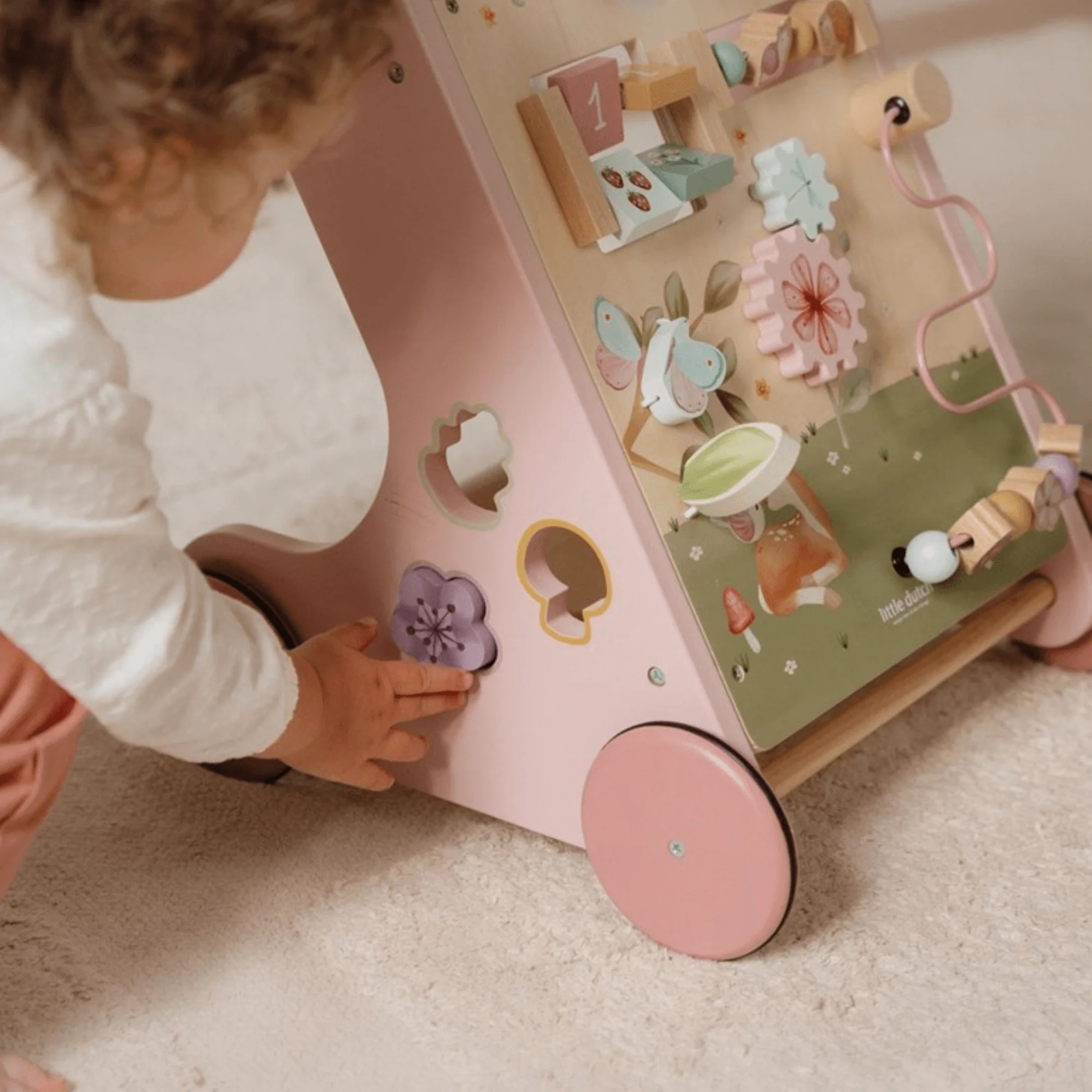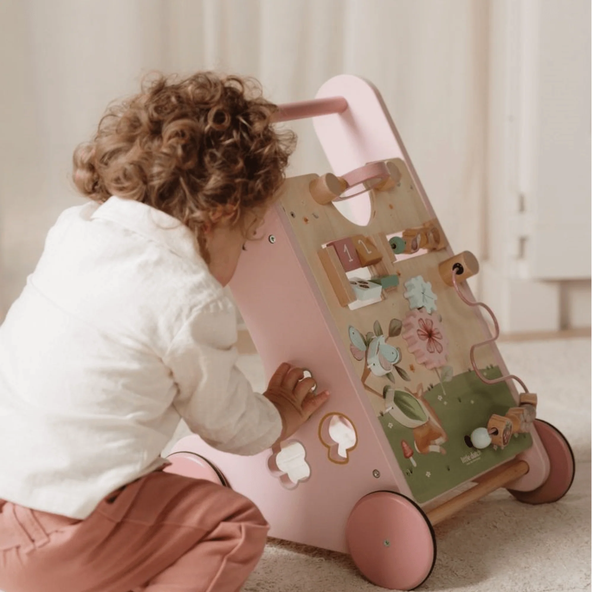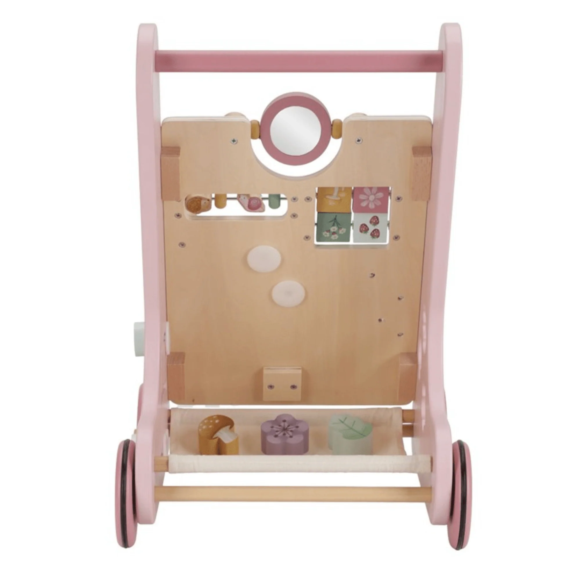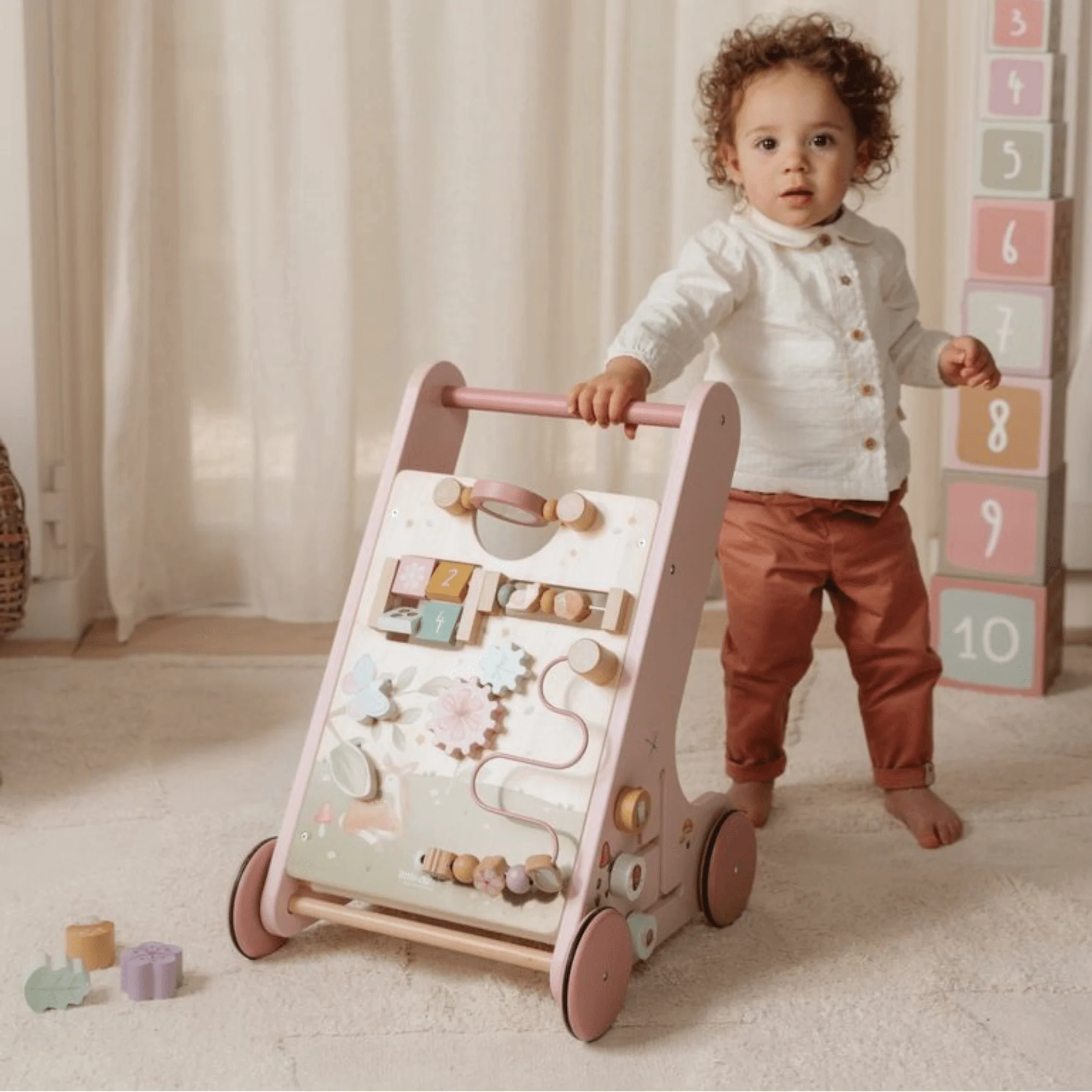 ¡Camina, juega y aprende! Te divertirás mucho explorando todas las actividades de este andador para bebés Fairy Garden. ¡Gira los engranajes para que la libélula gire alrededor de la flor! ¡Haz girar el espejo! Y aprende a contar con el caracol y el erizo. Este andador de actividades de madera ofrece varias actividades desafiantes que apoyan el desarrollo de las habilidades motoras de tu hijo. Desafíe a su pequeño con las muchas actividades de este andador bellamente decorado. Hay 8 actividades para descubrir y dominar. Con su diseño resistente, el andador es adecuado para niños de 12 meses en adelante que estén listos para dar sus primeros pasos. Prepárate para recibir estímulos entusiastas mientras tu pequeño se desplaza por la casa con este andador. Las ruedas de goma no dejarán marcas en el piso y son seguras para usar en interiores. Requiere ensamblaje por parte de un adulto.