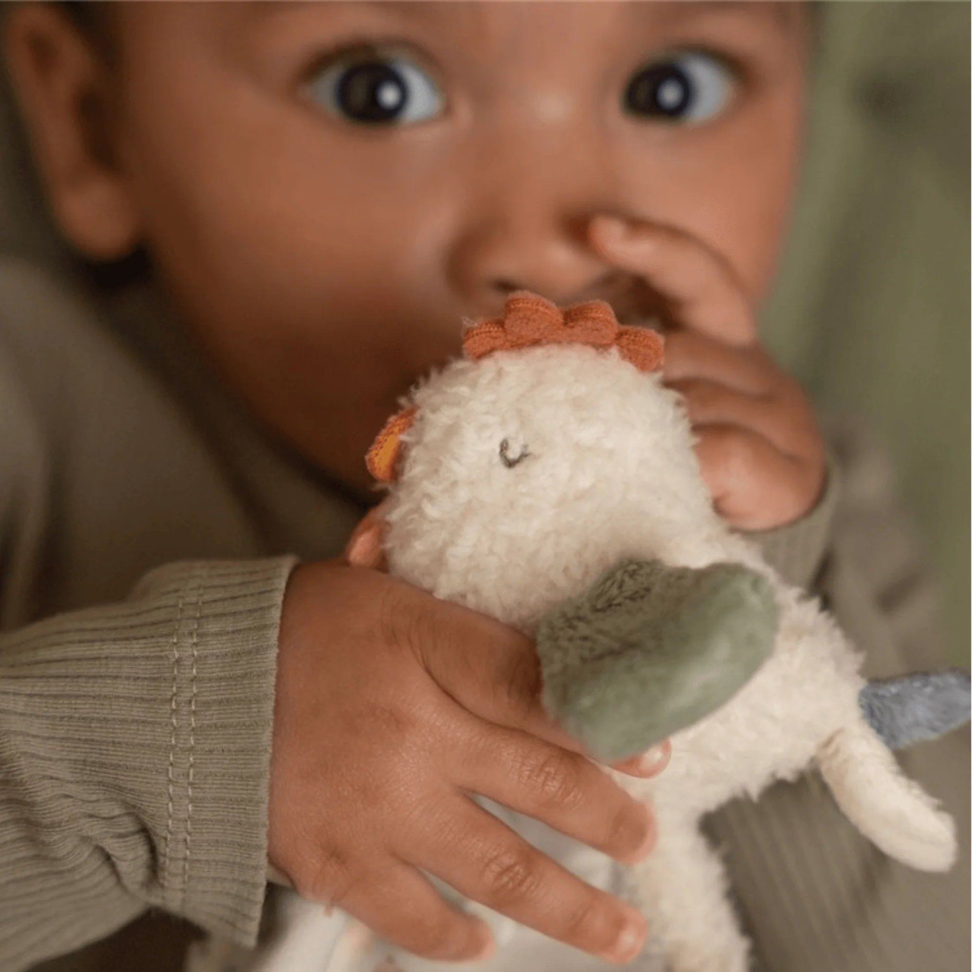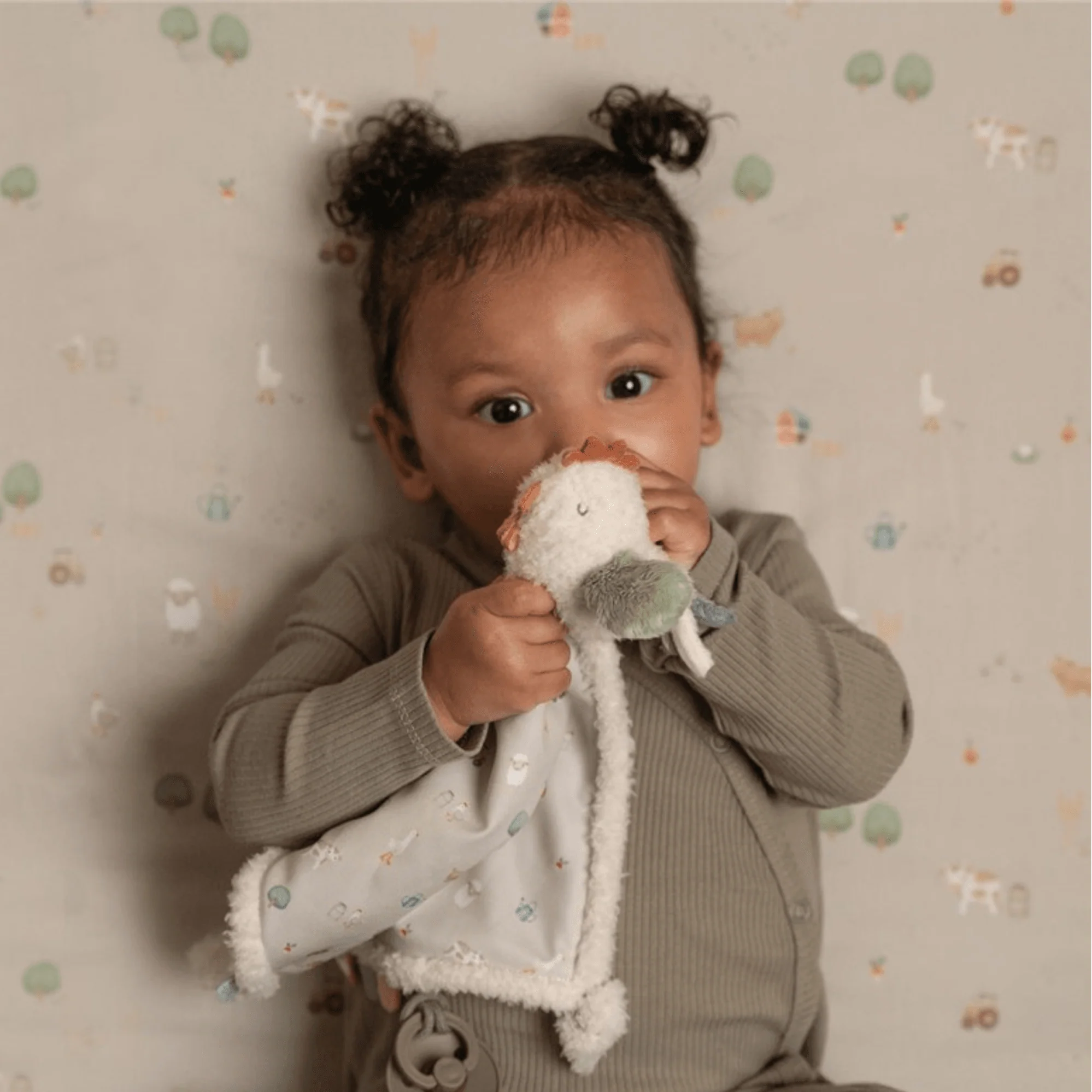 A los bebés les gusta tener este reconfortante doudou para abrazar al alcance de la mano en el parque infantil o en el cochecito. Esta impreso con nuestro diseño Little Farm y ofrece muchos detalles divertidos para descubrir, como lindas etiquetas que estimulan los sentidos y un lazo de algodón para sujetar fácilmente un chupete o anillo de dentición. La suavecita gallina le da un toque divertido a este doudou.
