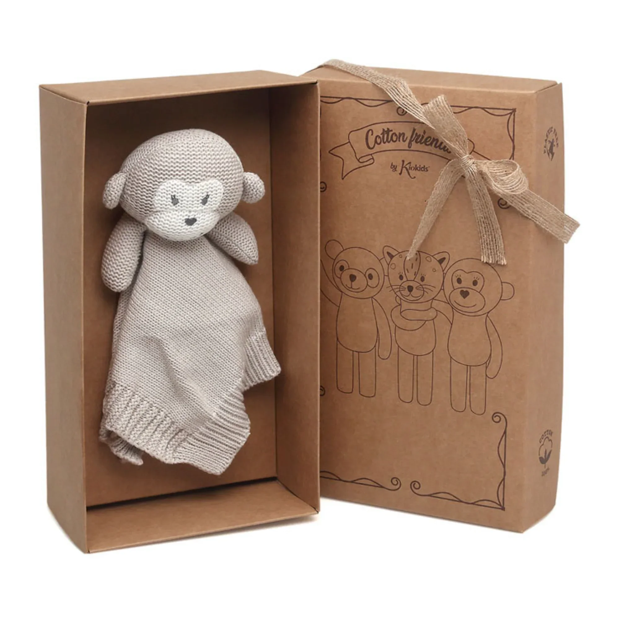 El dou dou de mono tejido es el compañero perfecto para los primeros meses de tu bebé. Diseñado para aportar bienestar, seguridad y calma, esta suave mantita de apego combina un adorable muñeco de mono tejido a mano con una manta hecha de algodón delicado y ligero, ideal para acompañar al bebé en momentos de sueño, pañuelo o calma.