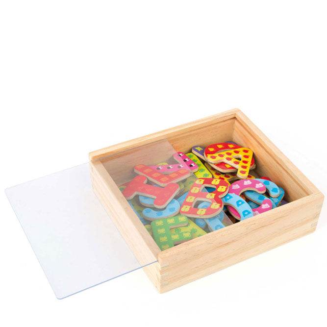 Las letras se pegan en todas las superficies magnéticas – así el frigorífico y la pizarra sirven para conquistar de manera lúdica el mundo de las letras. La caja de madera es el lugar ideal para guardar las 37 piezas de este juego.