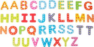 Juguete educativo. De madera pintada y con un reverso magnético, las letras multicolores invitan a escribir las primeras palabras. Cada letra tiene pequeñas figuritas dibujadas correspondientes a la primera inicial de cada palabra en inglés.