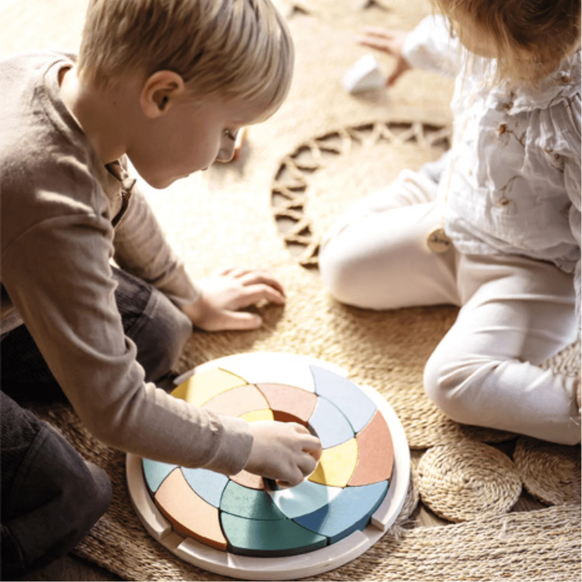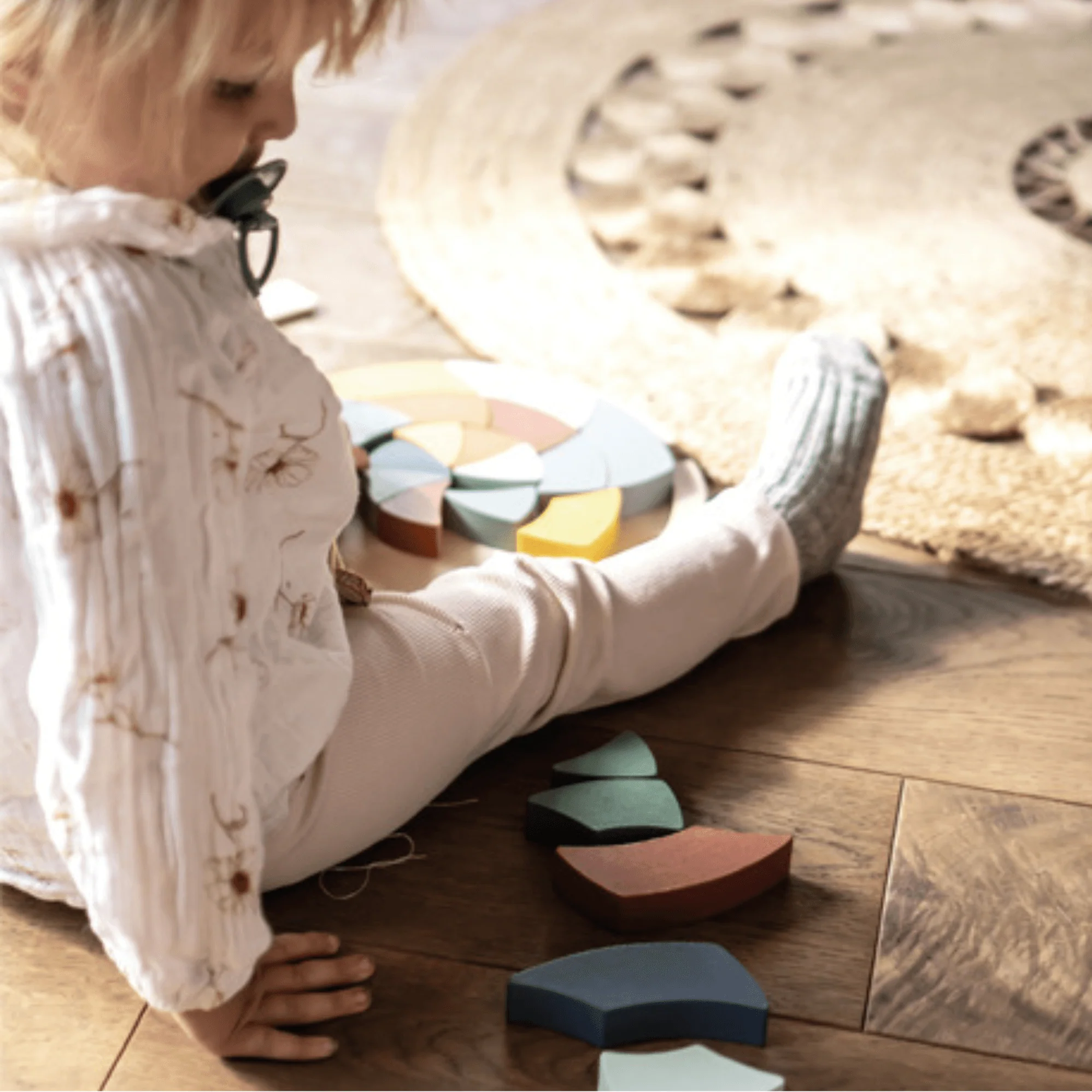 - Mandala compuesto de 24 piezas de rompecabezas de diferentes formas, colores y tamaños, así como una tabla de colocación de madera de alta calidad