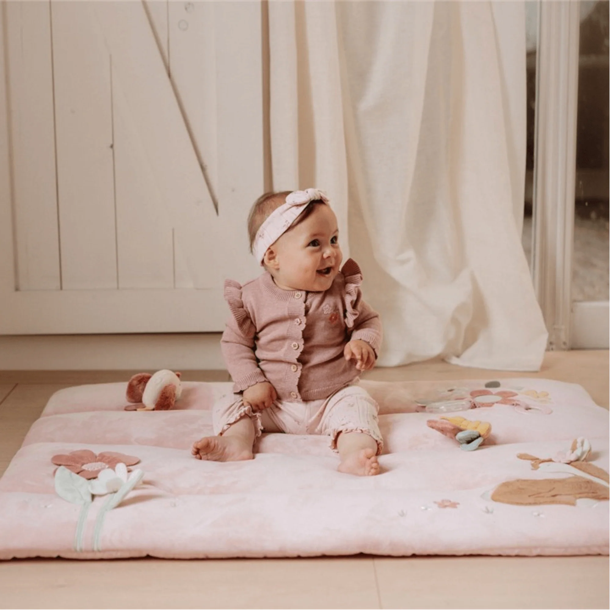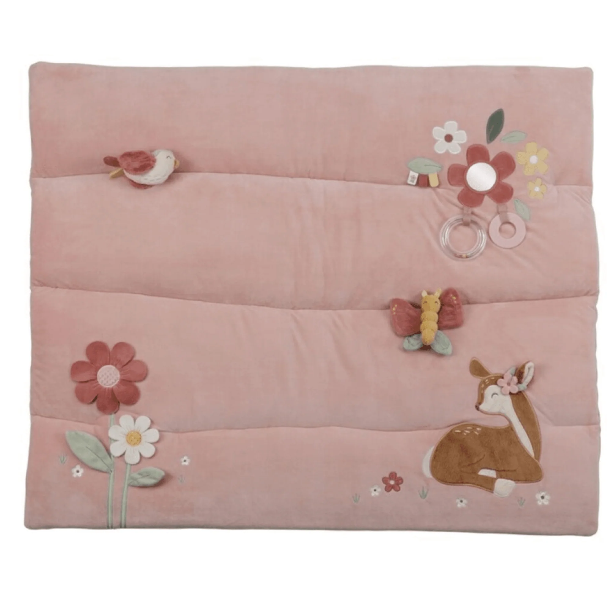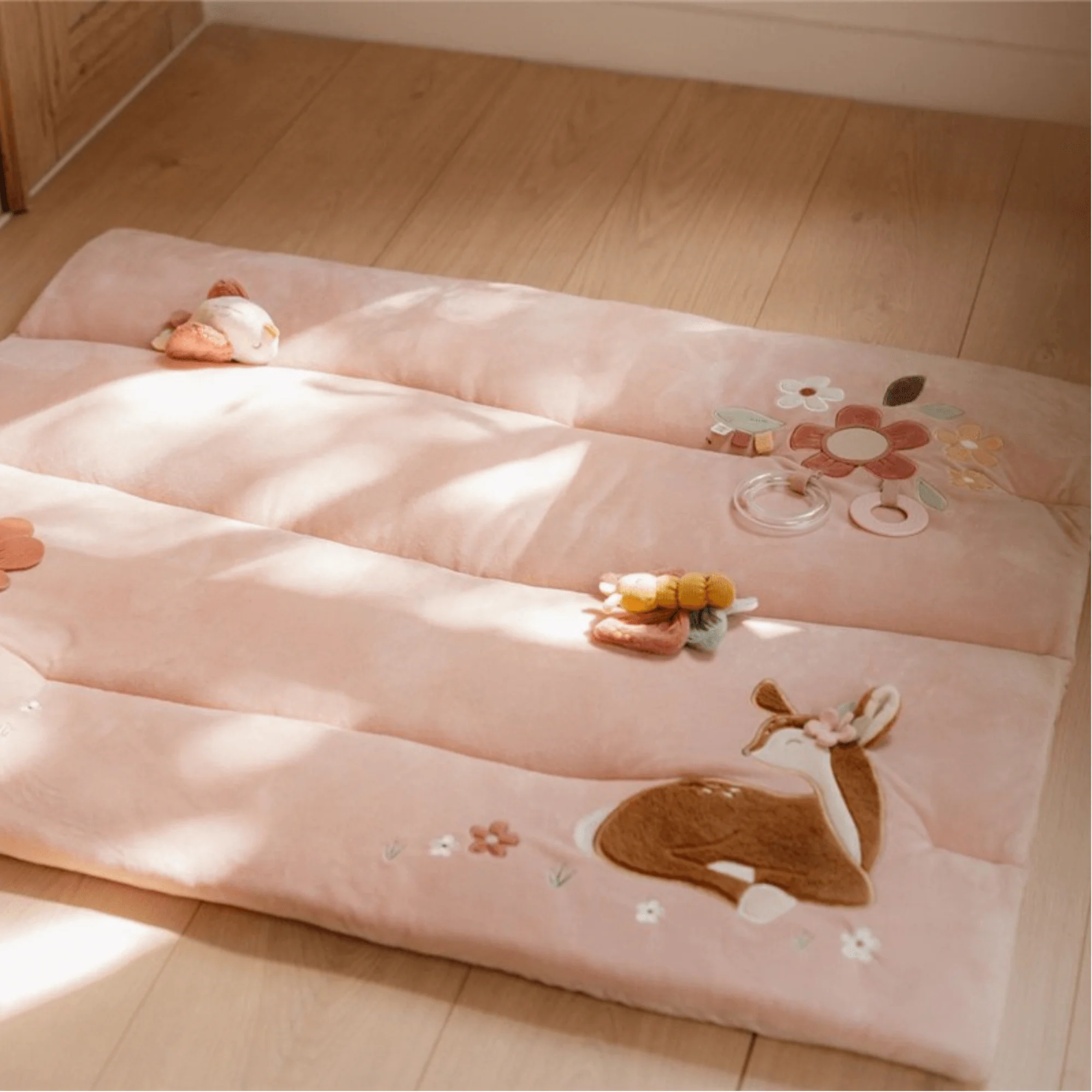 Sumérgete en el encantador Jardín de las Hadas con esta alfombra de juego rosa, diseñada para estimular los sentidos de los más pequeños. Su acolchado suave ofrece comodidad, mientras que sus múltiples texturas y actividades —como hojas crujientes, un ciervo de felpa, una mariposa, un pajarito, un espejo para la autoexploración y un anillo con cuentas sonoras— fomentan el desarrollo sensorial y la curiosidad. Ideal para crear un espacio seguro y divertido donde el niño puede explorar y aprender a través del juego.